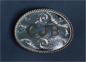 3" x 4" custom made oval belt buckle Heavy sterling silver overlay Twisted rope edge Handcut bronze initials Fully hand engraved |