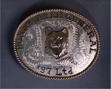 3 1/2" x 4 1/2" custom made belt buckle Heavy sterling overlay Bronze twisted rope edge Handcut bronze letters Custom bronze overlay |