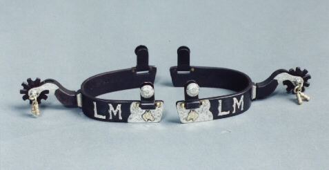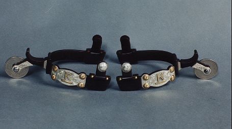 1" x 3/16" x 8 1/2" Band 2 1/4" Gooseneck shank 1 1/4" 10 point rowel Inlaid silver stripes in shank Sterling outside button Sterling silver brand | 1" x 3/16" x 8 1/2" Band 2" Gooseneck shank Partial Sterling Overlay Bronze horse head overlay 1 1/4" 10 point rowel Bronze jingle bobs Sterling Silver initial |