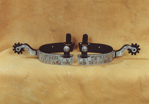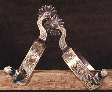 Full sterling silver overlay Hand cut letters and cutting horse overlay 2" Gooseneck shank 1 1/4" 10 point rowel Antique brown finish |